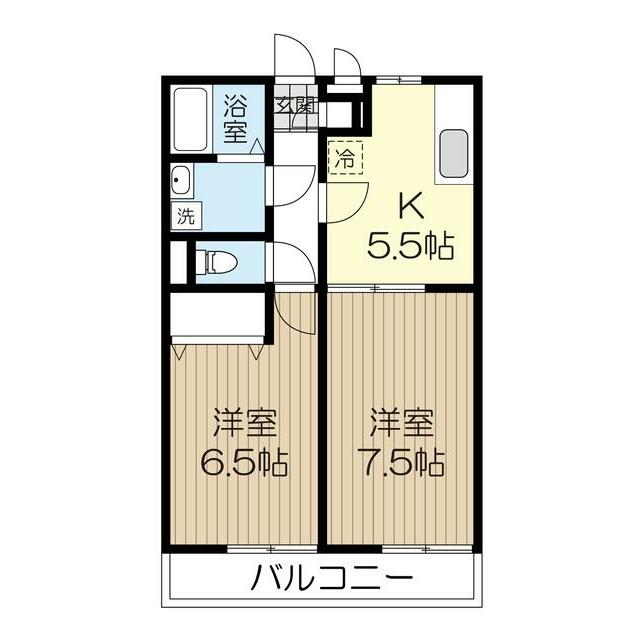 | 間取り | 2K(洋室7.5・洋室6.6・K5.5) | 主要採光面 | 東 |